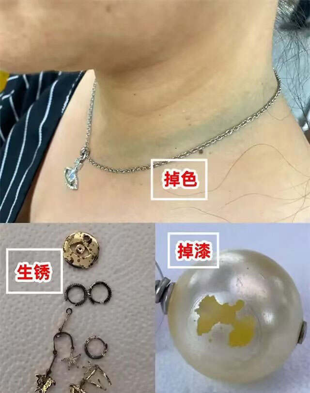 另外,配饰可是提升穿搭质感的关键,可不要因一时的贪小便宜,买一些容易掉色、生锈、掉漆等配饰,虽然价格低廉,但用的材质大多为劣质的金属,可能戴一次之后,就会出现↓图中这样的情况,甚至,有的皮肤很脆弱,还会导致过敏的现象,那可真的是“赔了夫人又折兵”。